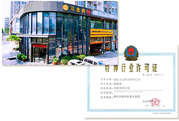 湖北斗金典當(dāng)有限公司于2011年在襄陽市注冊成立,《營業(yè)執(zhí)照》、《典當(dāng)經(jīng)營許可證》、《特種行業(yè)許可證》三證齊全。